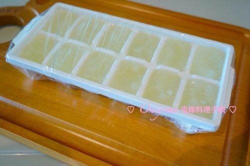 4)洋葱漿放入冰格中,蓋上保鮮膜,入冰箱雪成冰粒