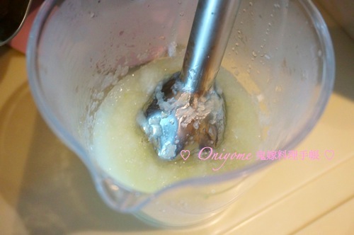 3)熟洋葱連汁倒進攪拌機,加水打成漿