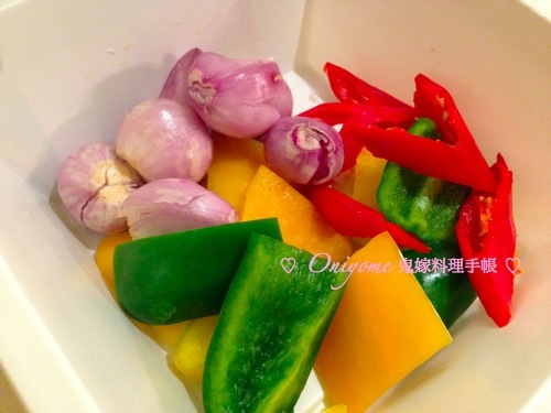 2) 略拍紅蔥頭和青蔥頭, 青黃椒切塊,尖椒斜斜的切成幾片
