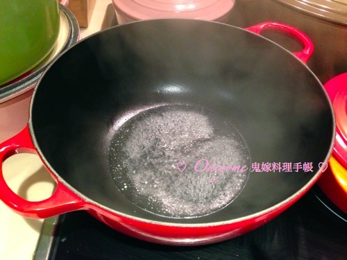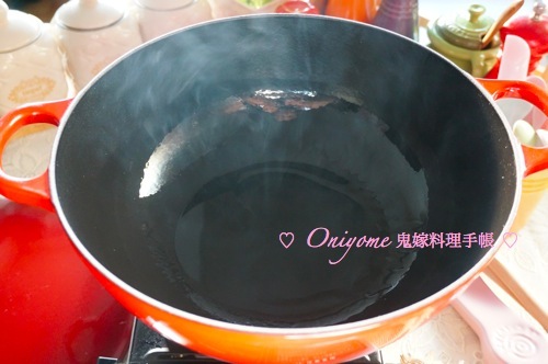 2) 鍋子加入熱水,中大火煮1分鐘至滾,倒掉水再抹乾,下油預熱1.5-2分鐘 , 至冒煙