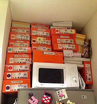 今天是Le Creuset 週年慶的大日子!  大家打算買什麼? 鬼嫁今次好冷靜,暫時沒入手! 你看~ 我的橙盒們已頂到上天花!    相公看到這篇可能會黑面回家了! 他不會走進這位置,一直都沒發現原來有一坐橙盒牆,呵呵!