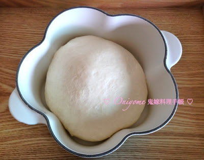第一次發酵後,漲得高高的,250g 竟可以這麼高,厲害! 有點擔心會頂著鍋蓋呢~