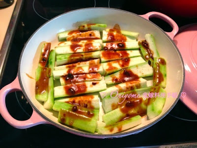 2) 勝瓜鋪在淺底鍋上或較深的碟,淋上麵豉水(嗜辣可加一點指天椒)