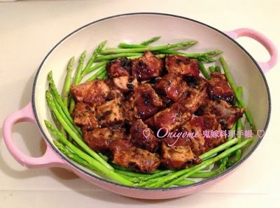 肉排本來打算做BBQ骨,但相公病了,要吃清淡一點,所以把肉排斬開,變成排骨(主因其實是我懶,不想出街再買菜,嘿嘿!)少部份用來煲湯,大部份拿來蒸,雖然豉汁蒸排骨一點都算不上清,但我家病人不吃粥,再加上病人金句,病已夠慘,再吃粥就慘上加慘,難得他有胃口,就來個偽清淡晚餐好了。 400g 的排骨用22buffet 都夠了,但新寵26雪紡粉真的好美,想多點用,所以在鍋邊鋪了露荀,效果很好耶~ 有肉有菜,一次過滿足兩個願望。