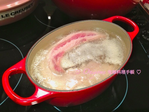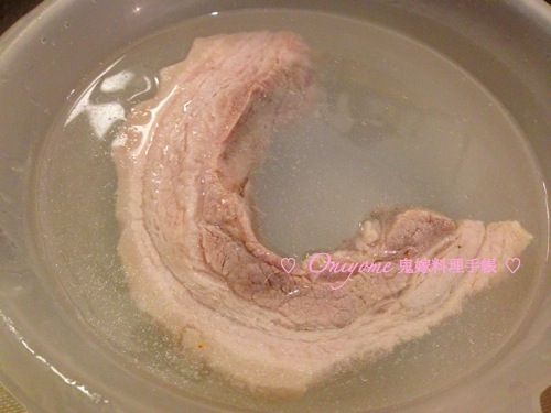 1) 五花腩去皮(如有) 洗淨 ,原條加入鍋子,再加入蓋過五花腩的水,開中小火,煮至微滾時,取出以溫水洗淨(此為跑活水,鍋子也要洗,真的很髒)