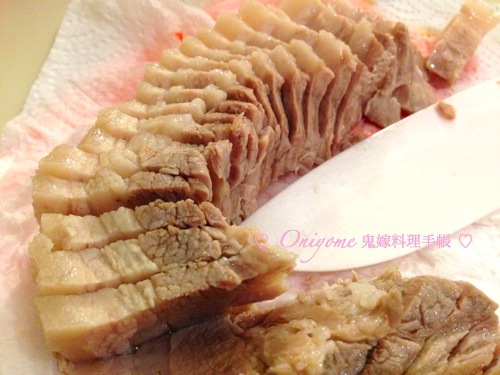 5) 五花腩吸乾水份,切成薄片,一刀過由刀尾拉向刀頭最好,不然會切碎,我用陶瓷刀,比較鋒利易切