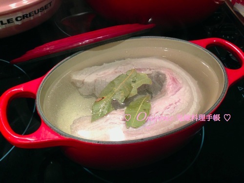 2) 鍋子燒滾水,加入香葉和原條豬腩肉,滾起轉小火加蓋煮40分鐘