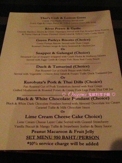 泰國廚師還不到30歲,在倫敦的米芝蓮餐廳學藝,回國後開了這間小店,沒有菜牌,只有指定的5道菜,用料新鮮,加入了泰國地道食材的創作料理,Fushion 卻不會不倫不類,看似不配的材料和調味,吃起來卻異常的配,看得出廚師的心血,上菜時間適中,不會太快或等到沒興緻,菜單每星期轉換,不怕吃厭。不但是味道,價錢更是驚喜地物超所值,5道菜950泰銖 (HK$ 225),吃了大半年,只加了 50 baht, 每次都吃到激飽。