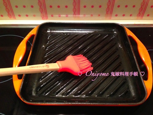 3)中大火預熱Grill Pan 30秒,平均掃上油,繼續加熱1分鐘至有輕煙出來(不夠熱再加長時間,pan