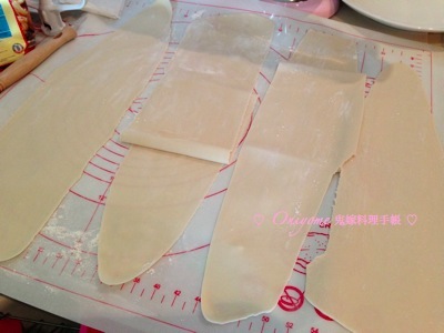 6) 轉2度壓兩次,再轉3度各壓2次至薄身, 中途灑上麵粉免黏