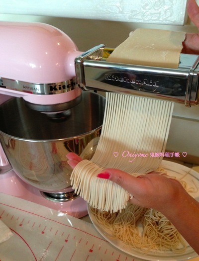 7) 換上切麵器,切成麵條,中途雙手沾粉或灑上麵粉免黏