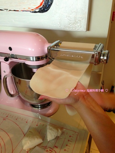 5) 小糰壓扁,壓麵器設定為1(KA最厚是1),壓完對摺再壓,前後2次,再多壓1次至平滑, 雙手沾粉,免麵餅黏起