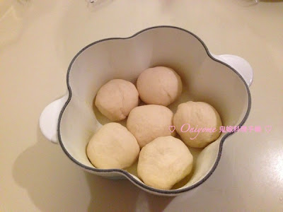 4) 用手按壓麵糰,排出空氣,以保鮮紙包好,再發酵20分鐘,拿出麵糰放在灑了高筋粉的工作台上, 切割成 6等份,滾圓,排在薄薄塗了牛油的花花煲中(或其他焗盤,切成8份也可以),