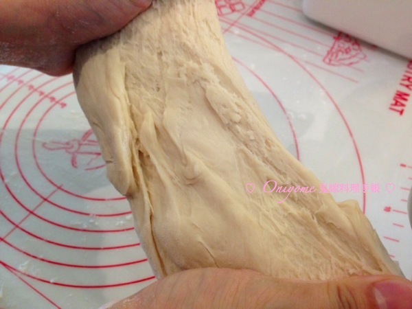 2) 加入牛油,搓至麵糰光滑,可拉開成薄膜狀態(