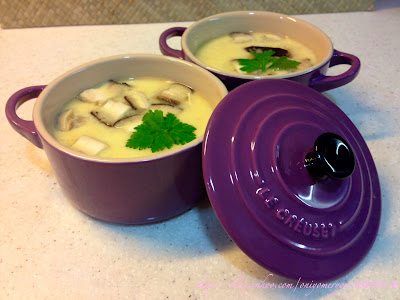 做法非常容易,2隻蛋,混和400ml 水和1包烏冬湯粉,加入喜愛的海鮮或雞肉,隔水蒸8分鐘