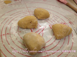 3) 換上壓麵器,粉糰切成4小糰,工作檯和雙手灑上麵粉