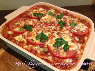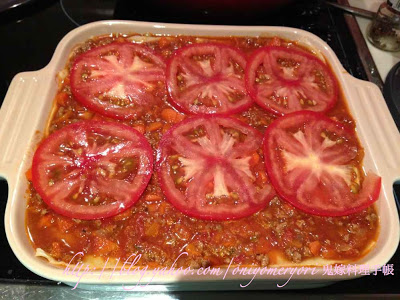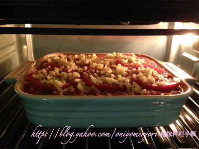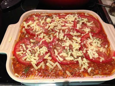 10)鋪好3﹣4層後,在最後的蕃茄肉醬及芝士上灑上百厘香(可如圖般加入蕃茄片),入焗爐以180度焗15﹣20分鐘(按包裝指示少5分鐘)