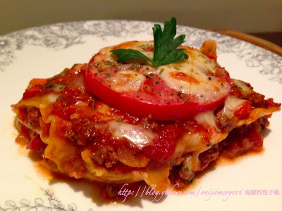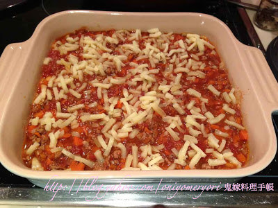 最愛芝士滿滿的肉醬千層麵,為新買的 Satin Blue 23cm Baking Dish 剪彩做千層麵,夠6﹣8人吃呢~ 用22cm鍋子煮6人份肉醬,打算分兩餐吃,但太好吃了,相公吃了很多,最後只剩1/6,不夠第二餐啊! 冰起來以後再吃好了。肉醬過夜會更入味,不妨前一天做好,第二天才焗,肉醬煮多一點,急凍留起之後我也可。2人份便用19cm長方型焗盤來焗。用 LC 來做千層麵最好不過,鍋子鎖水省時,45分鐘便煮好肉醬,焗盤有多種大小,最緊要顏色漂亮,令千層麵更好看,看起來更惹味,焗盤很易清潔,不黏底,清水浸浸已能去掉殘渣,好方便!