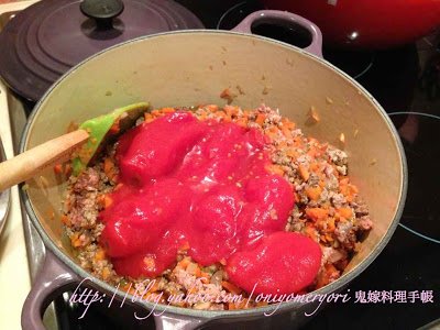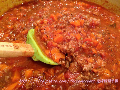 7) 蕃茄肉醬煮好後, 加少許糖、鹽及胡椒來調味