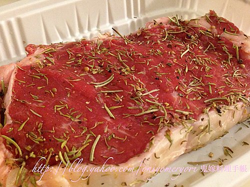 1) 牛扒洗淨用廚房紙抹乾,肥膏(如有)留起備用,百里香,迷迭香洗淨切碎
