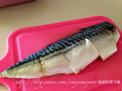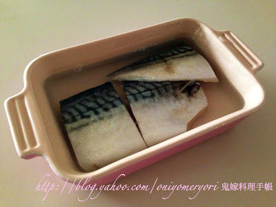 2) 預備小量熱水(夠浸過鯖魚),略浸鯖魚片,約2分鐘,去除腥臭味