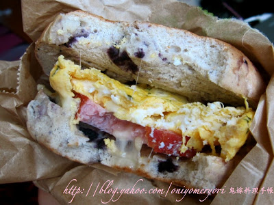 3) Bagel 上先放蕃茄,然後 Ham 和芝士,最後雞蛋