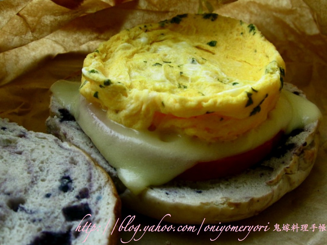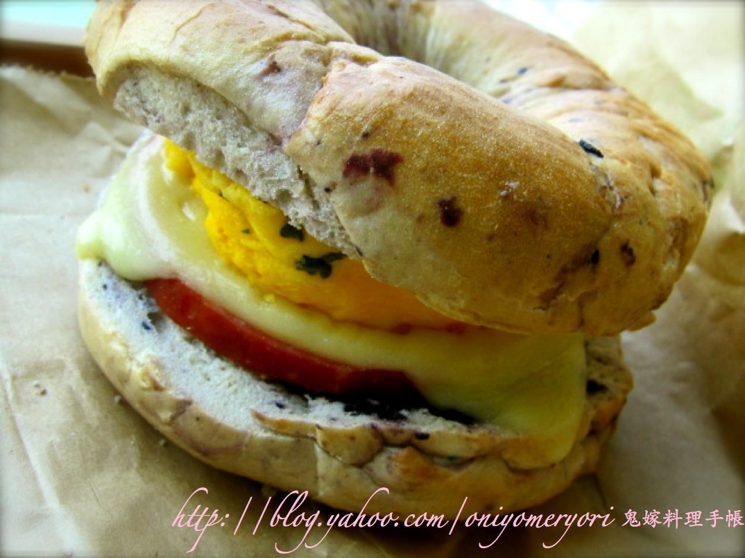 3) Bagel 上先放蕃茄,然後 Ham 和芝士,最後雞蛋