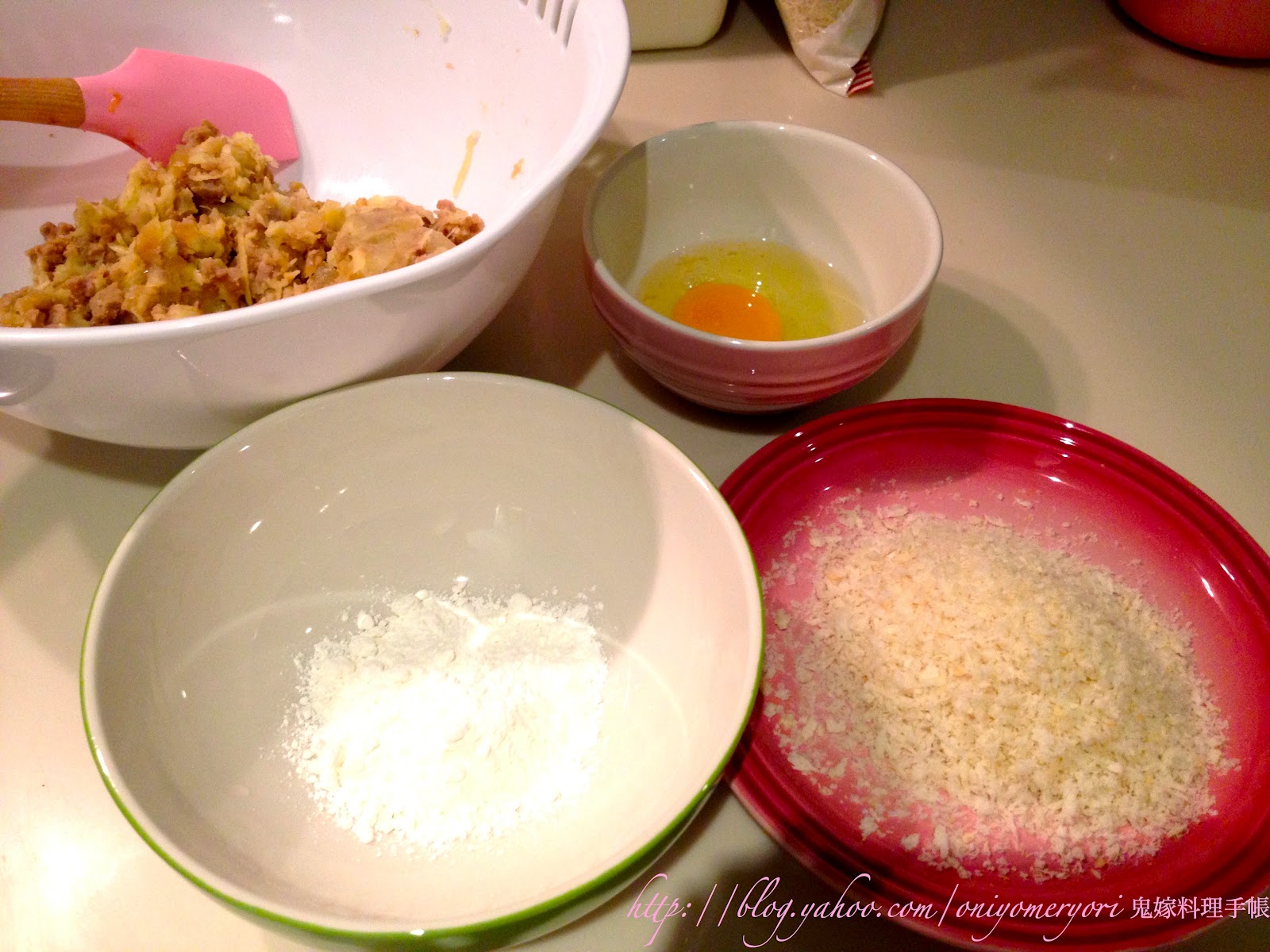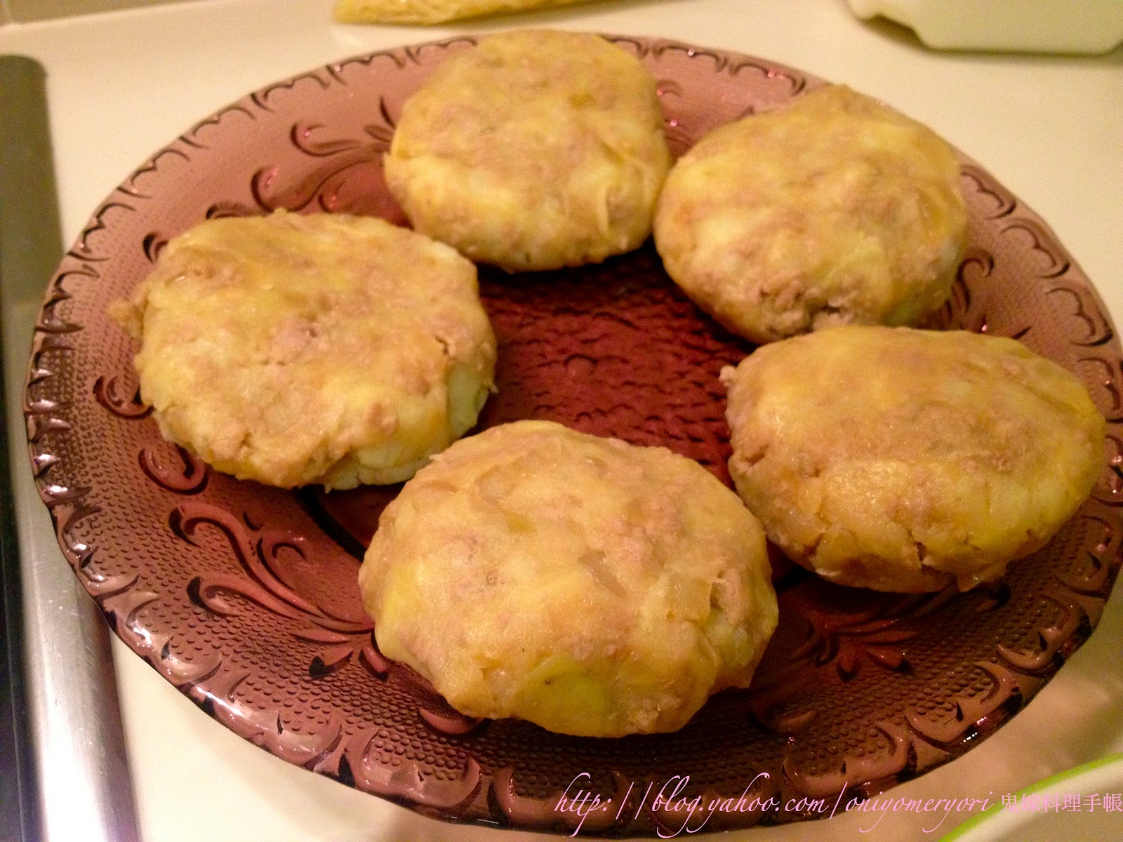 這道菜是這麼多深夜食堂菜式中最一波三折的一道菜,不是說它難整,而是材料難買再加停電,想買日本薯仔,原汁原味一點,專程去日本超市找,卻沒有,去了3家超市才買齊材料。討厭薯仔的相公聽說做可樂餅,起初以為是可樂做的餅,覺得很新奇,更正為炸薯餅後,臉有點青青的說,要交功課也沒辦法,沉默地走開去了。