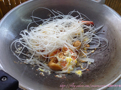 4) 下豆腐、菜脯、蔥、所有調味料和河粉,全部快速炒勻,上碟,洒上花生碎便成