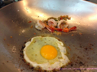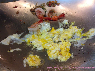 3) 把蝦移到一旁,下蛋,以鑊鏟拌勻2﹣3次弄碎,拌勻蝦