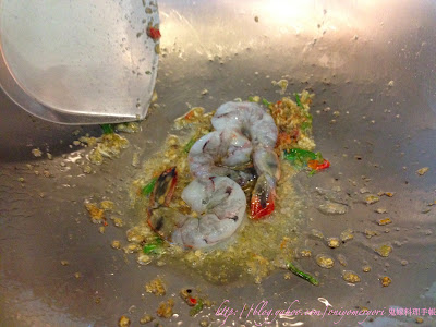 2) 炒鍋下油預熱,大火爆香蒜蓉,下蝦炒勻