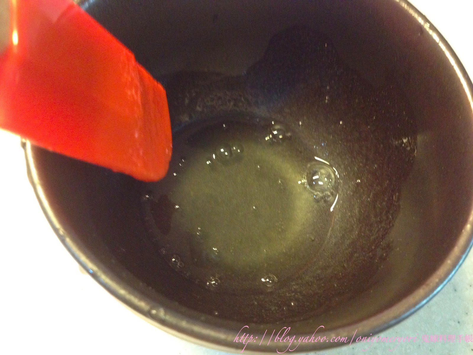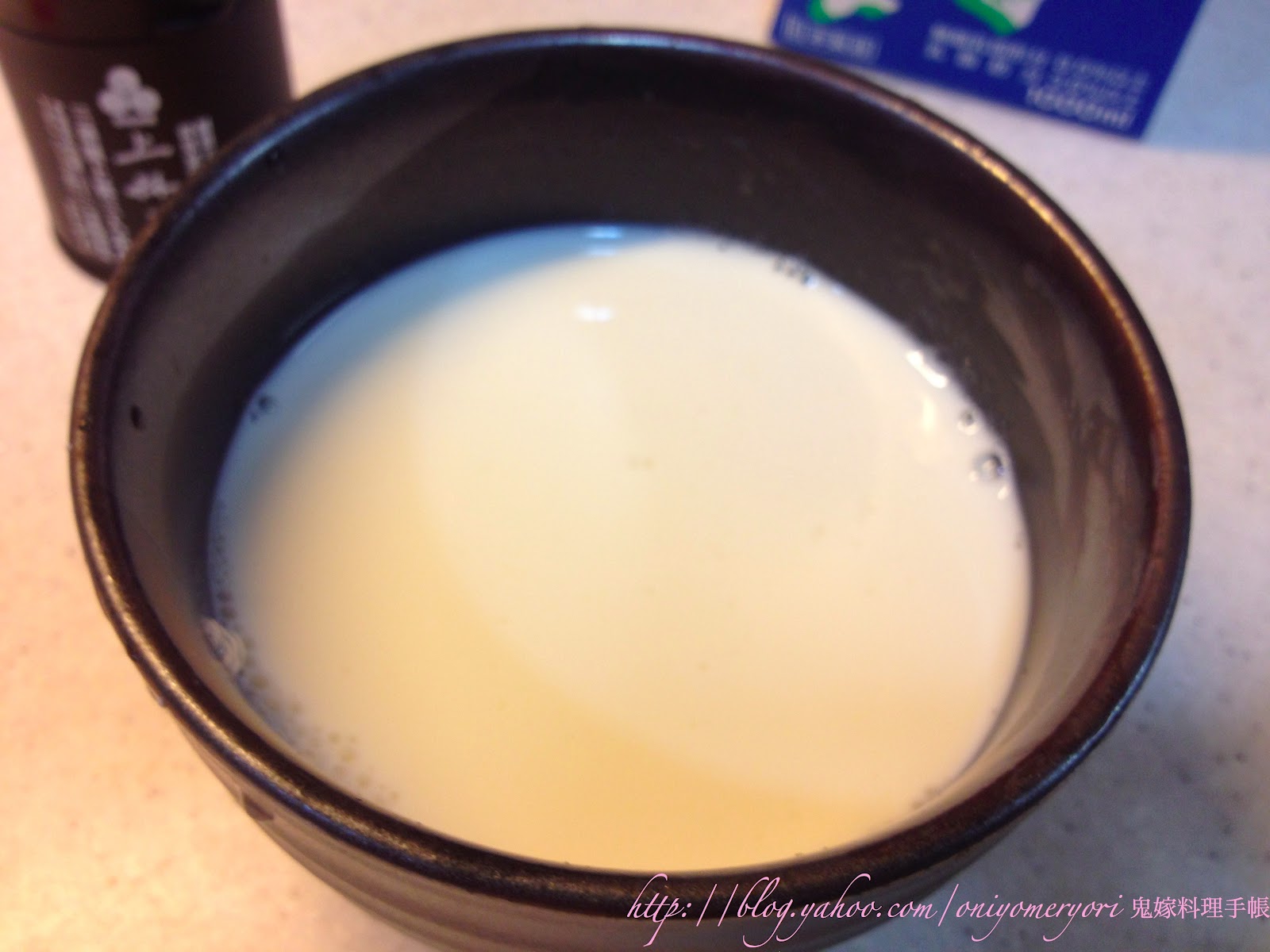 2)加入 牛乳及忌簾拌勻,入微波爐,中火加熱5分鐘,取出拌勻至魚膠粉完全溶掉(或用鍋中火加熱)