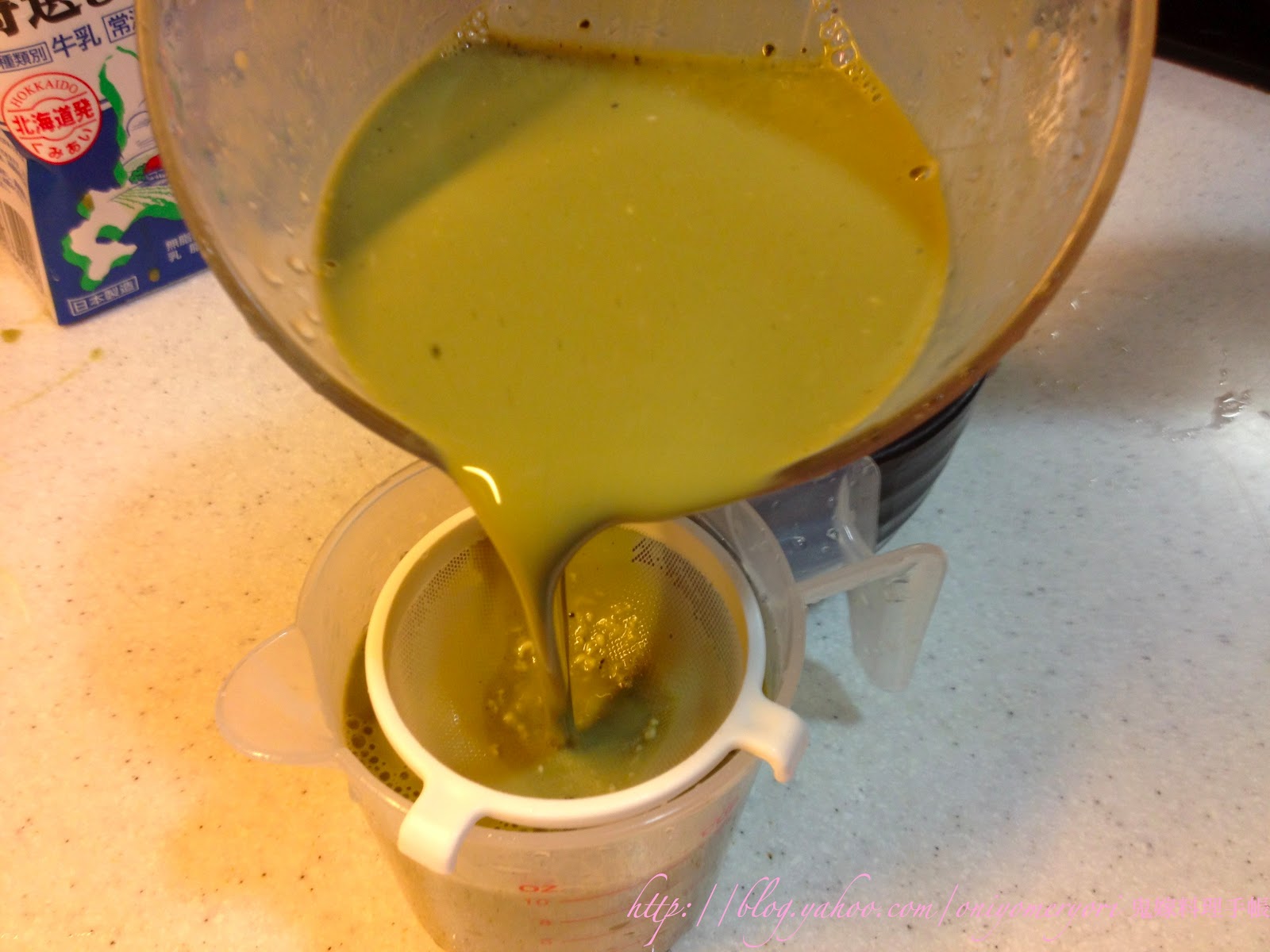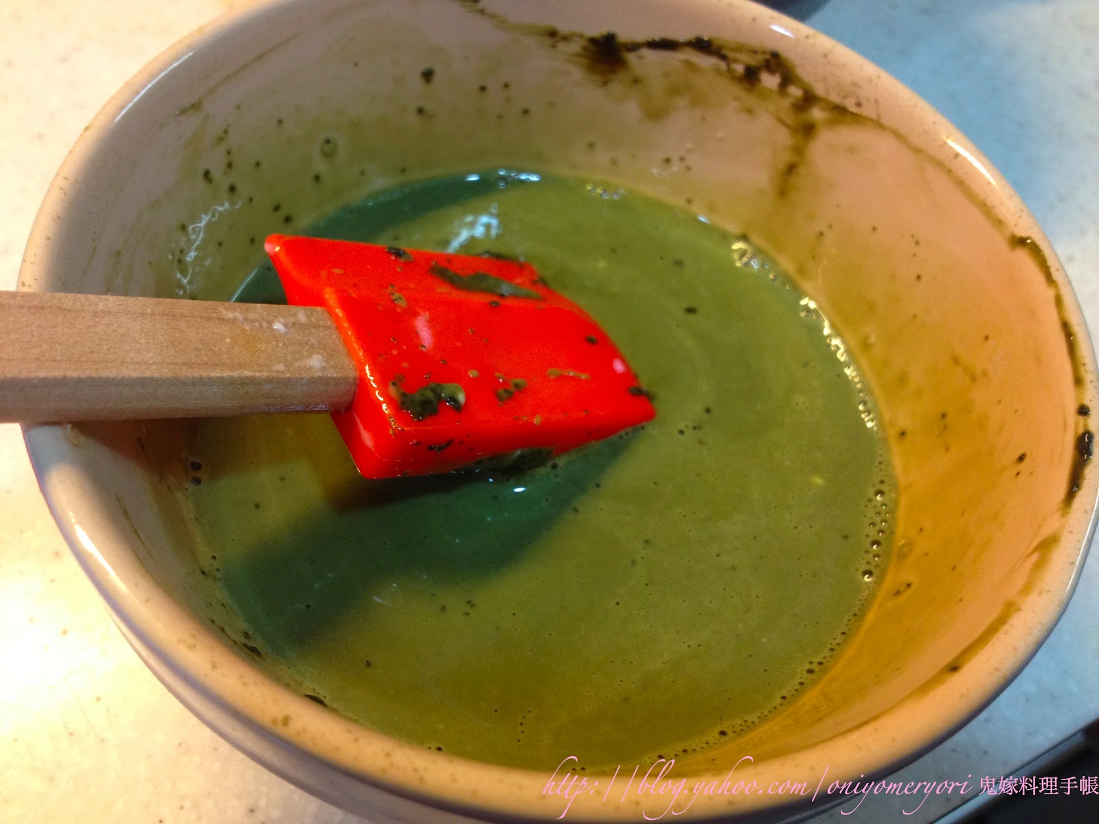 4) 分3次小量加入(2)的牛奶,拌勻練奶及抹茶粉