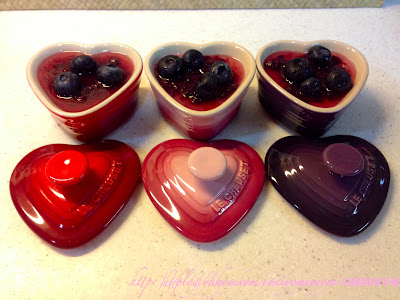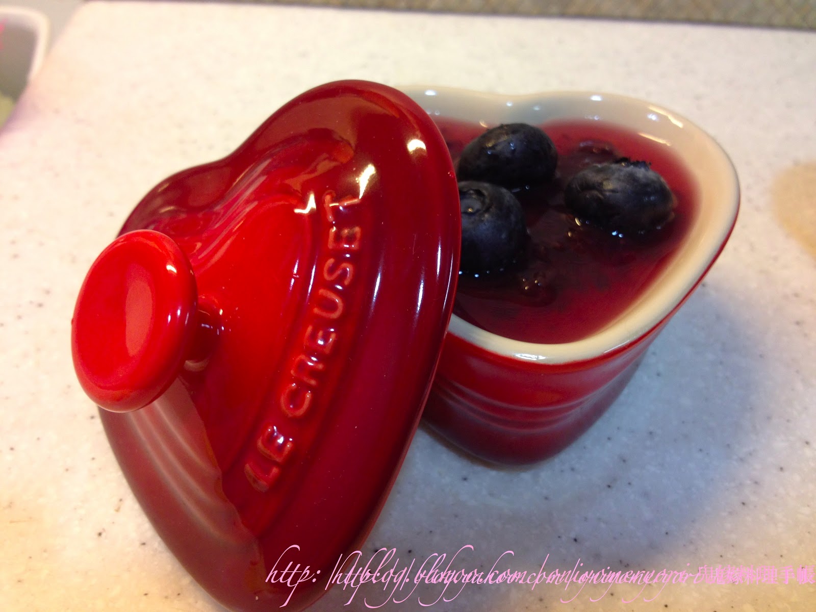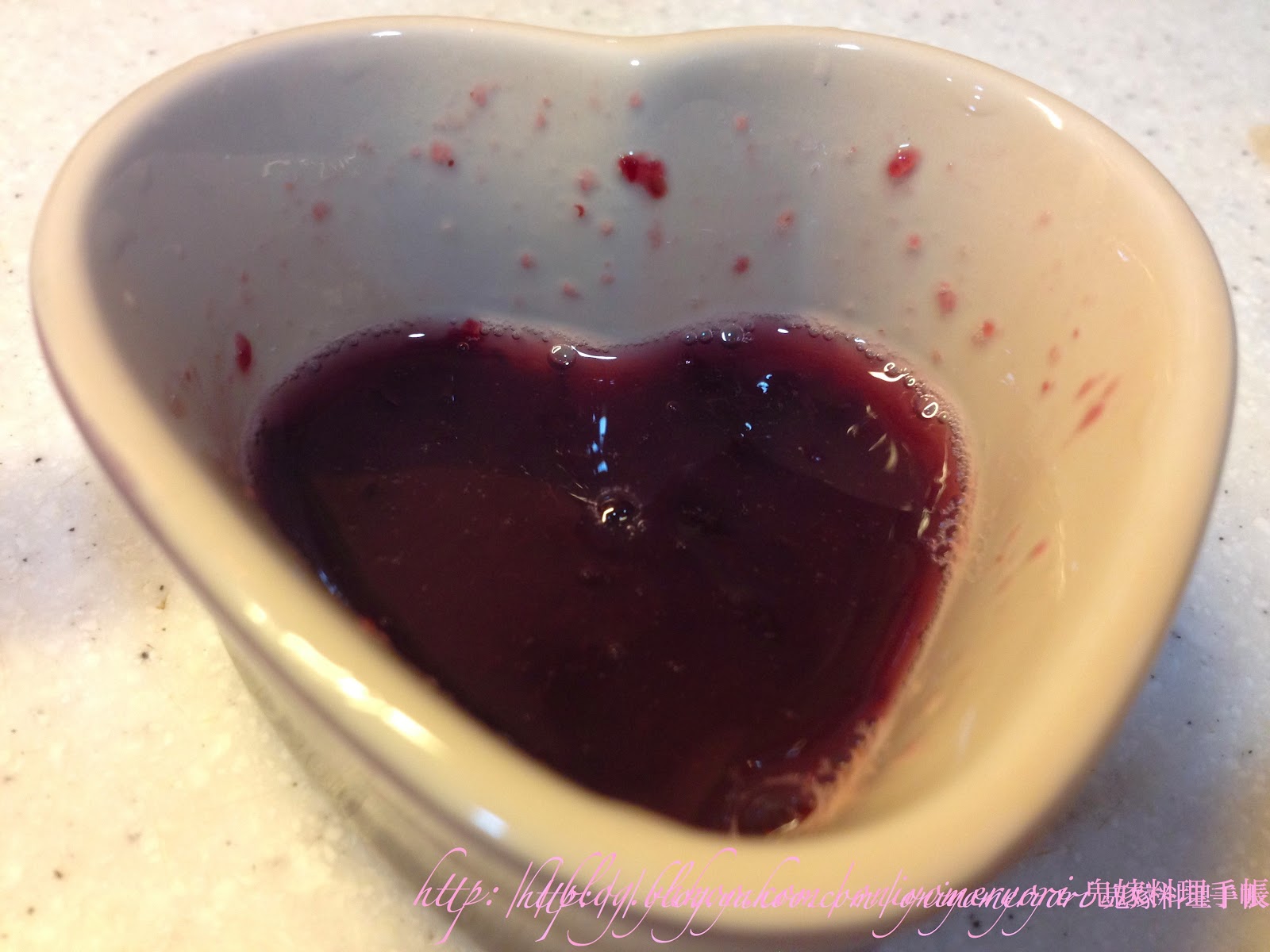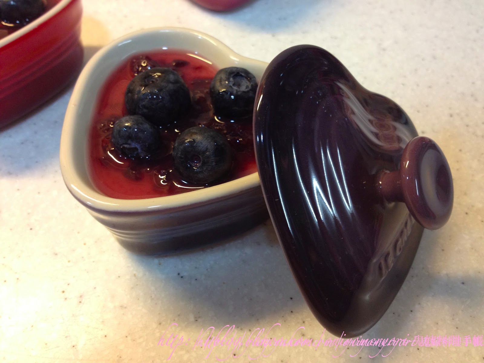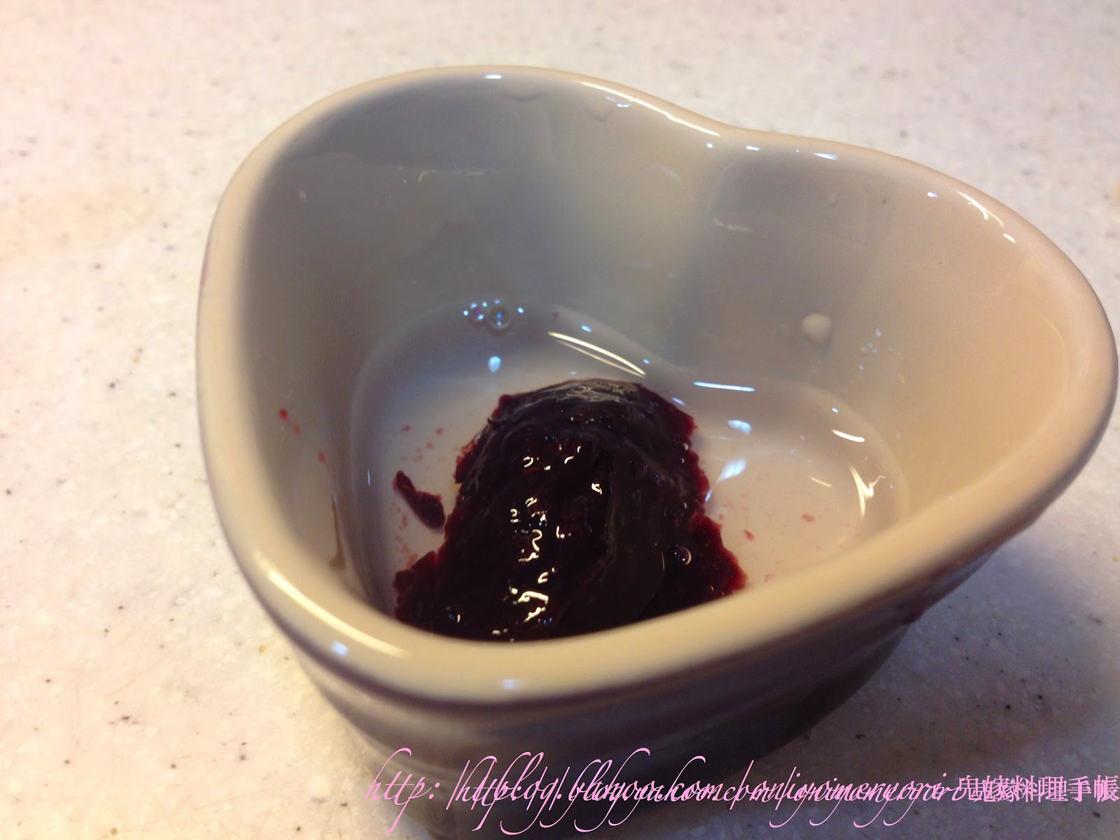 3) 果醬與水拌勻倒在布丁上再灑上藍梅便成