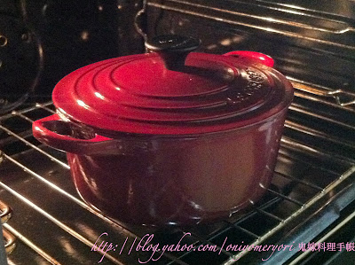 便像在爐頭炆的一樣,當然要用入得焗爐的鍋,如LC,黑色鍋蓋鈕最高是190度, 金屬就沒限制,一次過放了4個。煮好了低溫(30度)放焗爐保溫也可以。