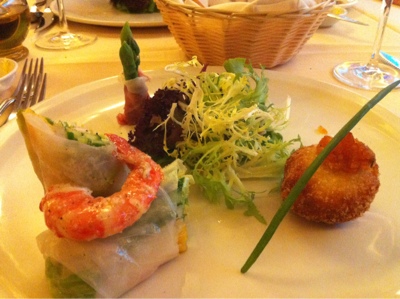 | 頭盤,no presentation at all, 左起 Rice Paper Spring Roll in Shrimp, Asparagus in Parma Ham, Crab cake |