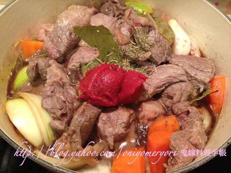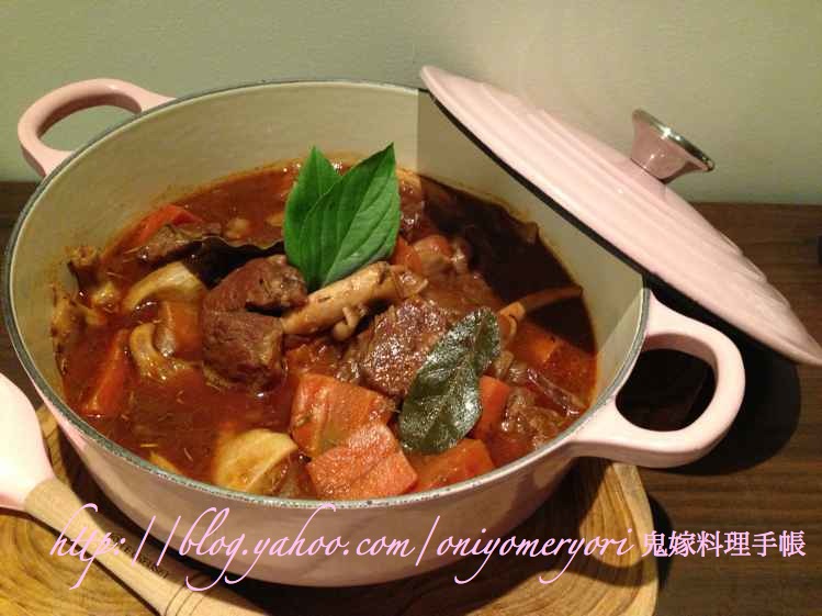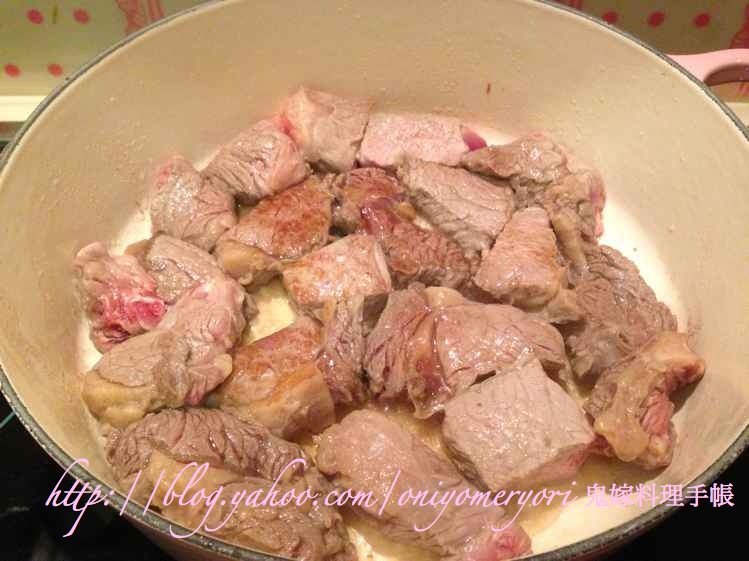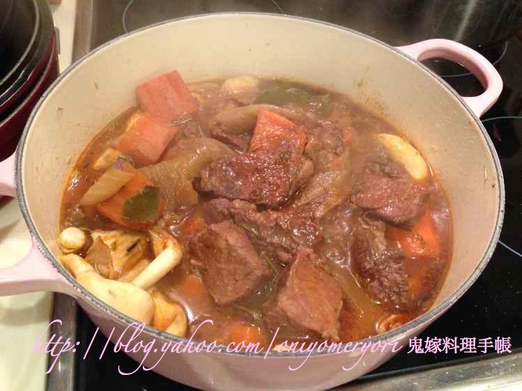 帶肥的肉是最好吃的,用LC的鍋子非常鎖水,以極少火來炆煮,非常軟稔,如爐頭要煮其他東西,連蓋入焗爐140度焗也可,而且更好吃,因為醬汁不會滾起,只是用焗爐的熱力令牛肉變軟,水份更能保存。