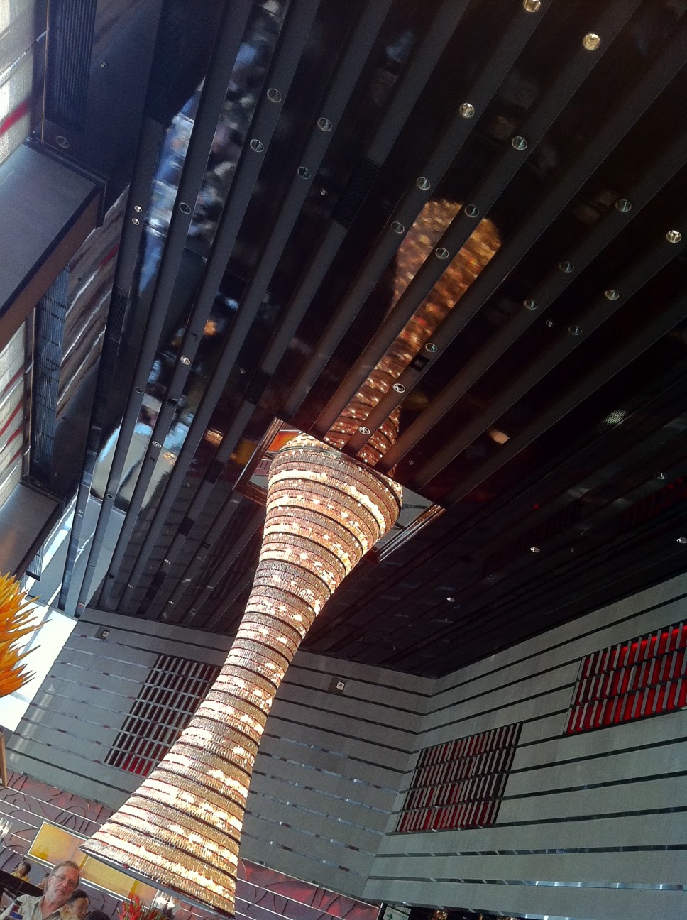 餐廳是一位日本設計師的作品,但沒什特別,也沒有日本的原素,日本友人說可能是要迎合中國人的口味,所以色調以紅金為主,最引人注目的是樓高兩層的巨型吊燈。