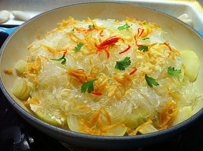 Le Creuset 料理精選 自家料理 ﹣中 自家料理 ﹣蔬菜 無水蒸 瑤柱粉絲蒸焗節瓜@LC2011年09月08日 | 累積瀏覽 913 Le Creuset 其中一個特點是可作無水蒸煮,今次試用22cm Buffet Casserole(淺底鍋 )來蒸節瓜, 同鍋上檯,十分方便。 材料 (二人份): 粉絲 1小包 (50g) 節瓜 2條 瑤柱 1 粒 蒜蓉 1 茶匙 蔥花或香芹 少許 指天椒 1 隻 (可以不加) 調味: 瑤柱水 150ml ... 看全文