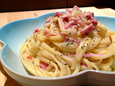 濃濃的芝士味令人又愛又恨,芝士忌廉煙肉,樣樣都好肥,不過用低脂的芝士忌廉來煮也不會太肥。這是相公最愛的意粉之一,但太肥,所以也不常吃,但越邪惡就越好味,二人前用了200g 粉,完全不夠耶! 沒有滿足的感覺,為了填補那空虛的感覺,我竟然。。竟然。。吃了大半包蝦片,邪惡深淵只有更深,唉~ (今次太趕時間,只有有人肚子超餓,沒有拍到中途的步驟!) 材料 (二人份): Spahetti意... 看全文 -