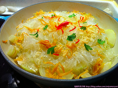 這是用LC的平底鍋來無水蒸的,其實有點似上湯炆焗,簡單方便。 材料: 節瓜 2條 瑤柱 1粒 雞湯 150ml 蒜蓉 1湯匙 粉絲 1包 (50g) 蔥花或香芹 少許 製法: 1) 瑤柱浸軟撕絲, 節瓜去皮、去心,切片(約1cm厚), 浸軟粉絲(熱水約3分鐘),剪碎(約三刀) 2) 節瓜鋪在鍋上或較深的碟 3) 再鋪上瑤柱... 看全文 -