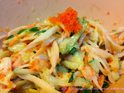 這是吃日本餐常出現的前菜,也是我一個人晚餐的好菜式,不用開爐,簡單好味,天氣熱自然想吃沙律,非常清新。 材料(1人份): 青瓜 半條 (用小青瓜的話1條) 蟹柳 5條 飛魚子 20g 調味: BB沙律醬 1湯匙 日本豉油 1茶匙 製法: 1) 青瓜切絲, 吸乾水份 2) 蟹柳撕成絲,混和飛魚子及所有調味便... 看全文 -