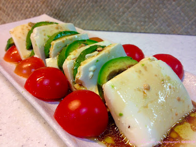 再來牛油果新搞作,清新又健康的沙律,沙律汁酸酸的,很開胃。 材料: 牛油果 1隻 日本豆腐 1磚 車厘茄 4粒 碎紫菜 少許 沙律汁調味: 日本豉油 1茶匙 Wasabi 1茶匙 鰹魚汁(冷麵汁) 1湯匙 檸檬汁 1茶匙 橄欖油 2 茶匙 製法: 1) 牛油果及豆腐切片, 車厘茄一開四, 沙律... 看全文 -
