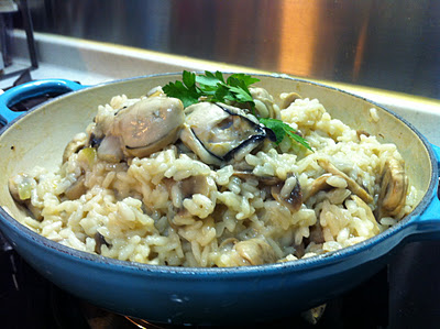Oyster Risotto ﹣蠔肉意大利飯 (附食譜)2011年10月10日 | 累積瀏覽 1335 這個不單是兩二人甜甜蜜蜜燭光晚餐的好選擇,大伙兒開 Party 也很好,加大份量也不難,又飽肚又有特色。 Oyster Risotto in Le Creuset Caribbean Blue 22" Buffet Casserole 材料 (二人份): 急凍廣島蠔(或其他蠔) 10﹣12隻 洋蔥 1/4個 Arborio Rice (意大利米) 1/2 cup 清雞湯 (Chicken Broth) 1½ cup 碎帕馬森芝士 (Parm... 看全文