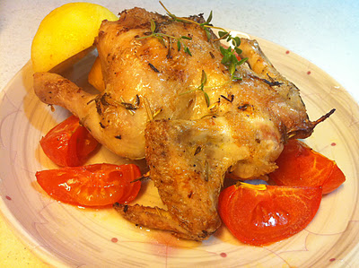 香草檸檬焗法國春雞(附食譜)2011年10月21日 | 累積瀏覽 488 春雞減價的時候一定會買一隻回來放冰箱備用,想不到吃什麼時便烤來吃,我家是用大焗爐的,轉動式叉起來燒最好吃,但清潔焗爐這麼偉大的工程沒人想做,所以只好用焗盤了。 材料 : 法國春雞 1隻 檸檬 1 個 蕃茄 1個 調味: 牛油 10g 新鮮百里香(Thyme) 3條 新鮮迷迭香 (Rosemary) 3條 Extra Olive Oil... 看全文