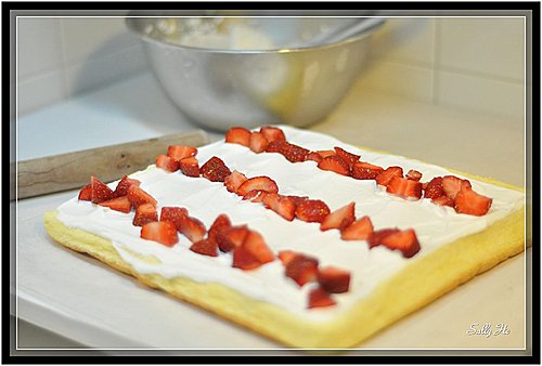 7.放凉后撕去背面的牛油纸,蛋糕皮朝下鋪到新的油纸上。把打發的淡忌廉抹平,留下四邊,排上士多啤粒,卷起来,用油纸包好,過一會去除油纸。
