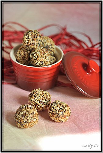 4. 滾上朱古力做糖衣,再滾上杏仁粒即成