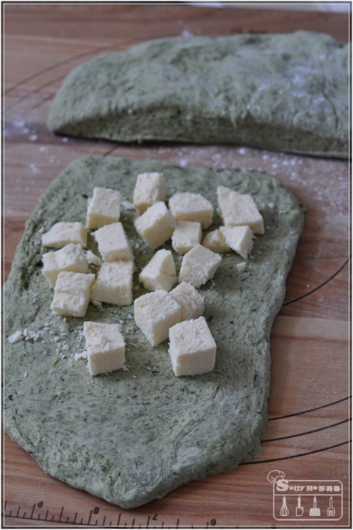 6. 將麵團按偏,包入已切粒的Emmental芝士,然後滾成欖型;