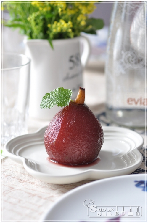 (6) 紅酒只是僅僅蓋過梨就可以,不夠的話再加紅酒、水和糖(1杯紅酒+水:1/3杯的糖)