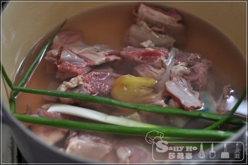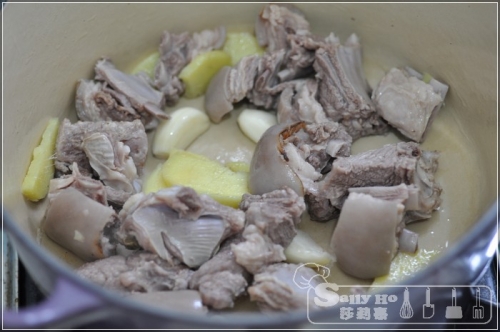 加水及雞湯,下腐乳、南乳及磨豉醬,水要過所有材料,